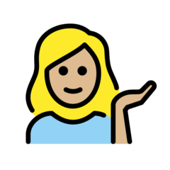 | Codepunkt | U+1F481 1F3FC 200D 2640 FE0F 1F481 - 💁 Infoschalter-Mitarbeiter(in) |